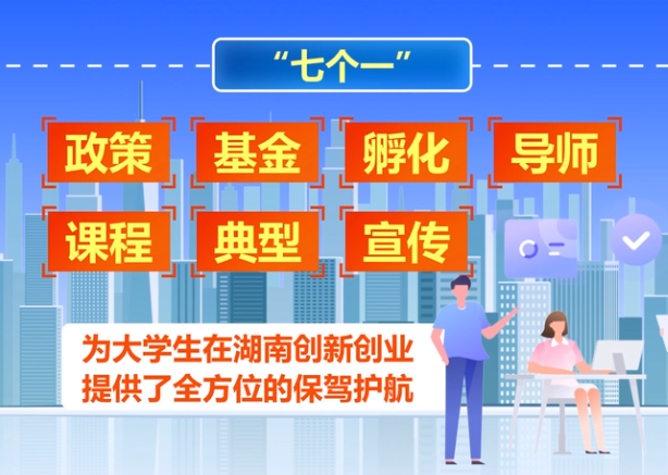 湖南积极部署支持大学生创新创业“七个一”行动,让大学生在湘创业更吃香,“七个一”涵盖了政策、基金、孵化、导师、课程、典型、宣传七个方面,为大学生在湖南创新创业,提供了全方位的保驾护航。